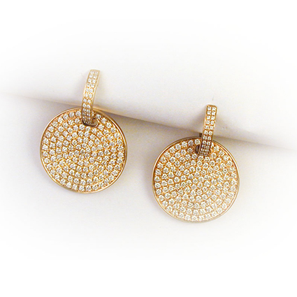 14k yellow gold 9 gram pave set diamond earrings, 4.30ct tw. Each earring contains one hundred and fifty-six round brilliant cut SI-G/H diamonds. The 20.5mm diameter, 2mm thick disc dangles from a 2.5mm wide hinged oval hoop.