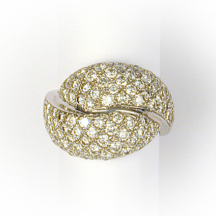 One 18k white gold pave set diamond ring weighing 11.5 grams. There are 90 round brilliant cut VS-G/H diamonds set in a domed bypass style, 2.42ct tw. Finger size 6. The ring measures 16x6mm at center top tapering to a 5x1mm shank.