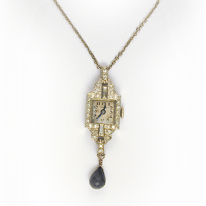 Estate platinum and diamond Croton mechanical watch converted to a pendant – 1/3ct tw in diamonds, 4 grams with an onyx briolette dangle. Shown on a 20” 14k white gold 1.3mm cable chain weighing 3.3 grams. Complete with chain.
